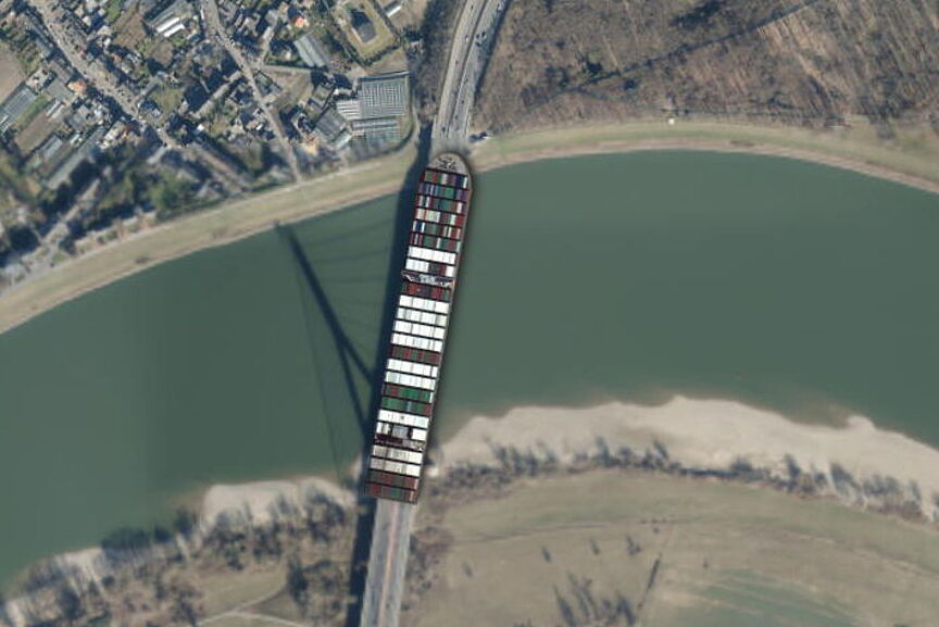 Wir alle haben in den vergangenen Tagen gebannt die verfolgt, wie ein riesiges Containerschiff den Suezkanal verstopfte und den globalisierten Handel für eine Woche zum Lockdown brachte. Wissenschaftler warnen schon seit längerem, dass diese Riesenschiffe unsere Transport-Infrastruktur überfordern. Auch eine Gruppe von Architektur- und Bauingenieurstudenden der TH Aachen beschäftigte sich mit dem Thema und kam dabei auf eine visionäre Idee. Denn Schiffscontainer sind ja schon seit längerem ein gängiges Element für Tiny House-Konzepte. Und die im Suez-Kanal havarierte Ever Given will, so sagen Experten, die lieber ungenannt bleiben möchten, bald kein Hafen und kein Kanalbetreiber mehr einlaufen lassen, weil das viel zu gefährlich sei. Warum nicht das eine mit dem anderen verbinden, aus der Not eine Tugend machen und der japanischen Reederei der Ever Given ein attraktives Angebot unterbreiten? Das Schiff ist nämlich ziemlich genau so lang wie die Fleher Brücke - und es könnte diese problemlos ersetzten. Die Idee der Studierenden: Die Ever Given wird im Rhein quer gestellt und ersetzt die Flehe Brücke. Ein teurer und langwieriger Neubau wird damit überflüssig. Im Untergeschoss wird der Autoverkehr abgewickelt. Darüber findet Radverkehr statt, lärm- und wettergeschützt. Da das Schiff mit 59 Metern deutlich breiter ist als ein Radschnellweg, lassen sich im Radverkehrs-Geschoss Fahrradläden, Cafés und Bett&Bike-Hotels unterbringen - Terrassen mit Rheinblick inklusive. Darüber ist Platz für bezahlbare Studentenwohnungen, ein TEU-Container von 6*2,5 Metern je Studierenden genügt. Wenn man jeden zweiten Container für urban Gardening und Erholungsfunktionien reserviert, lassen sich so auf zehn Stockwerken Wohnungen für bis zu 10000 Studierende unterbringen.
