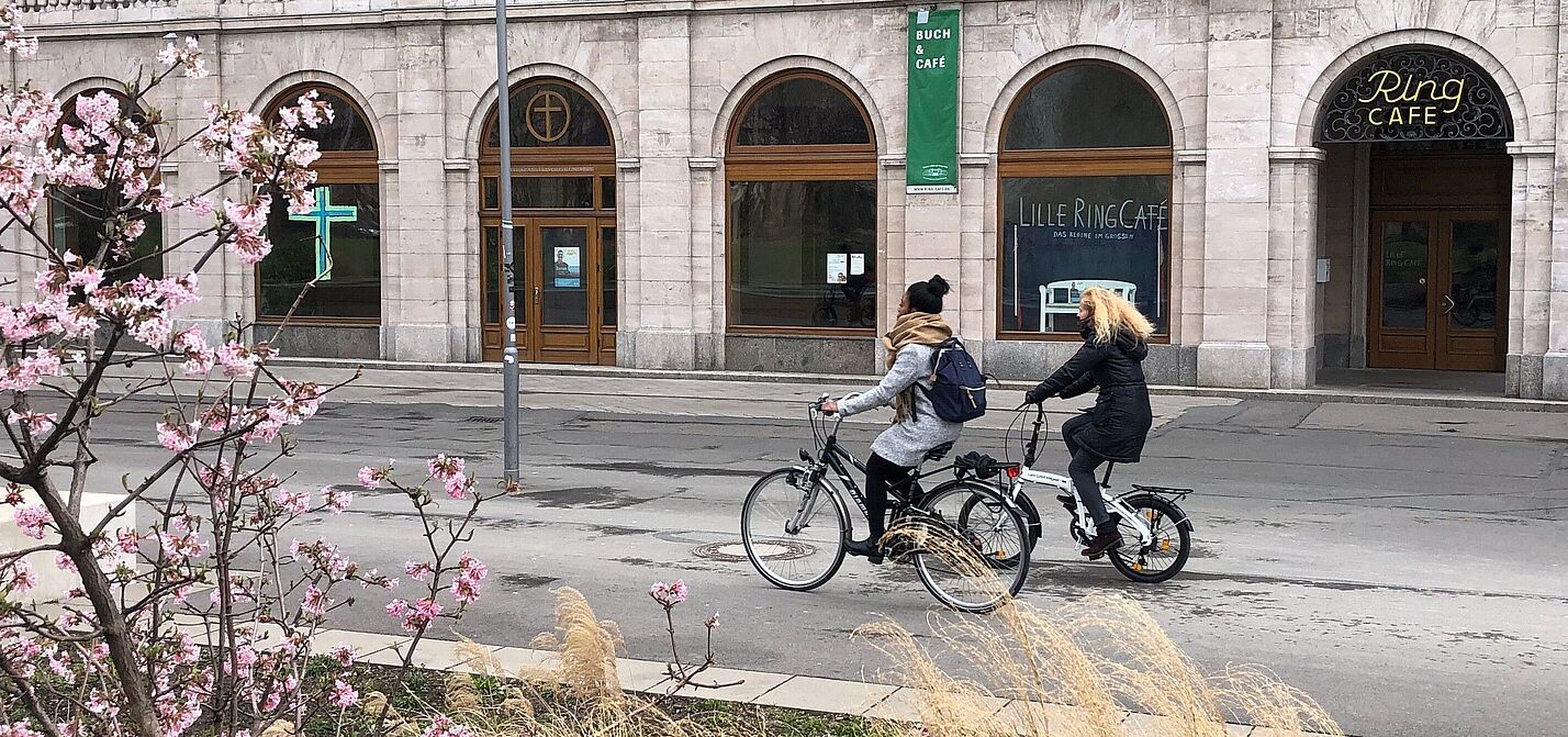 Zwei Radfahrerinnen in Leipzig im Winter